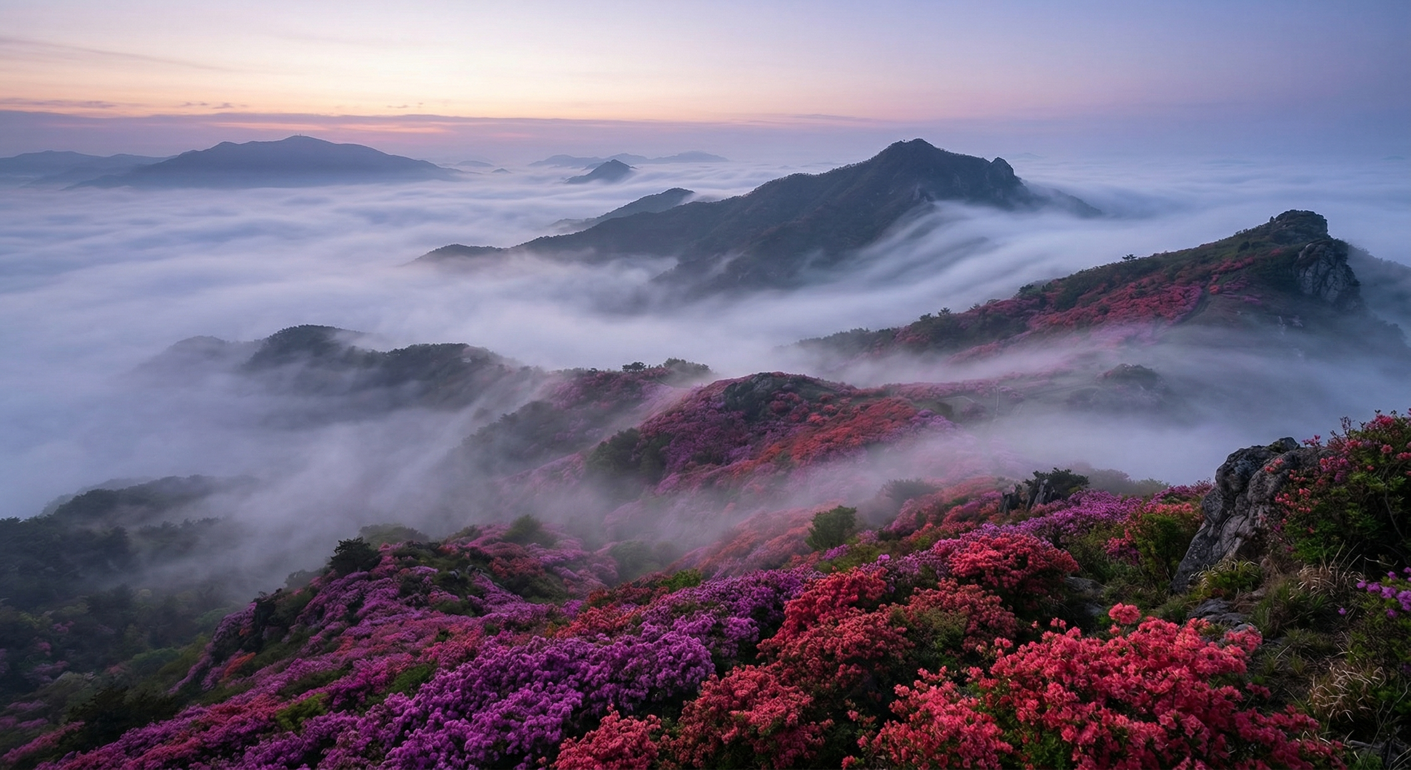 [새벽 5시, 황매산 철쭉 군락지의 광활한 풍경과 안개 속에 서서히 드러나는 철쭉의 강렬한 색채]
