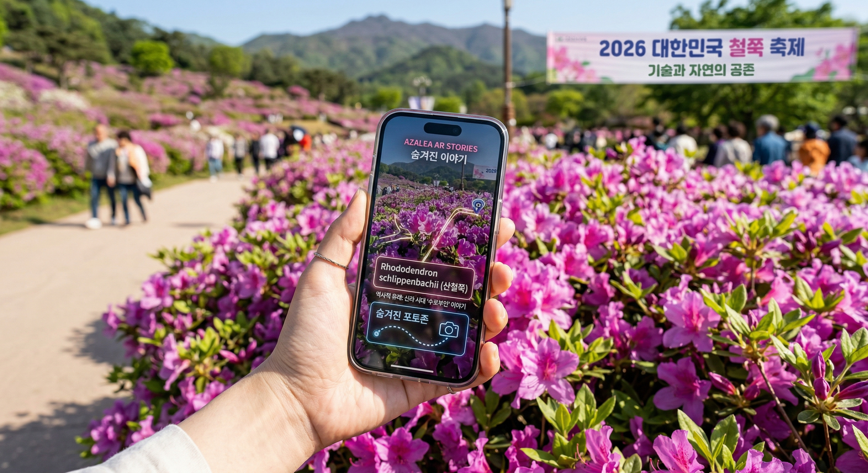 [스마트폰 AR 앱을 통해 철쭉의 숨겨진 이야기를 확인하며, 기술과 자연이 공존하는 새로운 형태의 축제를 즐기는 모습]