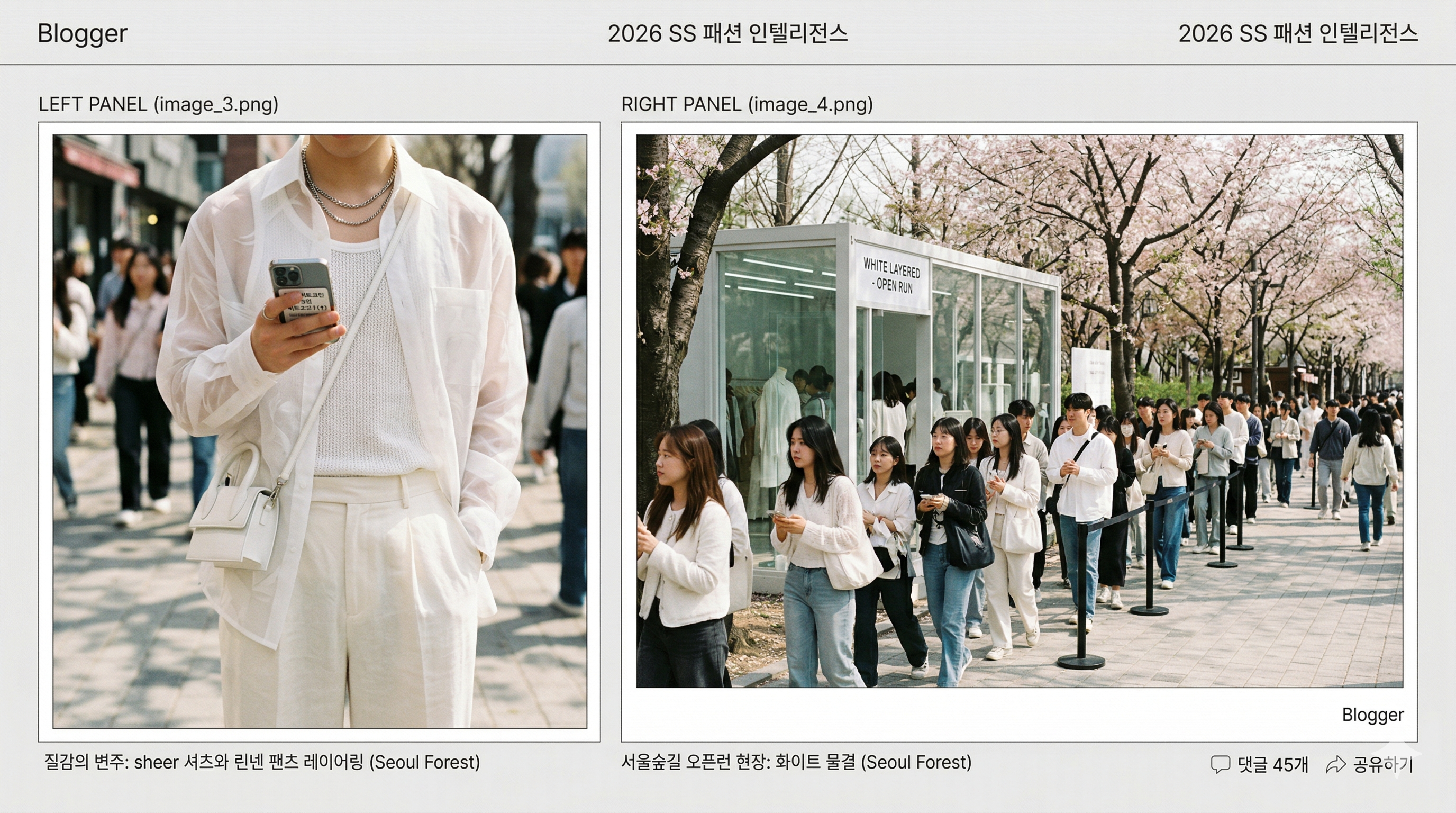 2026년 4월, 서울의 패션 지형도가 성수동 서울숲길을 중심으로 재편되고 있습니다. 이번 시즌을 관통하는 가장 강력한 메가 트렌드는 단연 '화이트 레이어드(White Layered)'입니다.