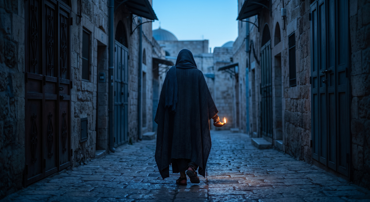 푸른 새벽빛이 감도는 예루살렘의 좁은 골목길, 망토를 뒤집어쓴 니고데모의 손에서 흔들리는 작은 등불